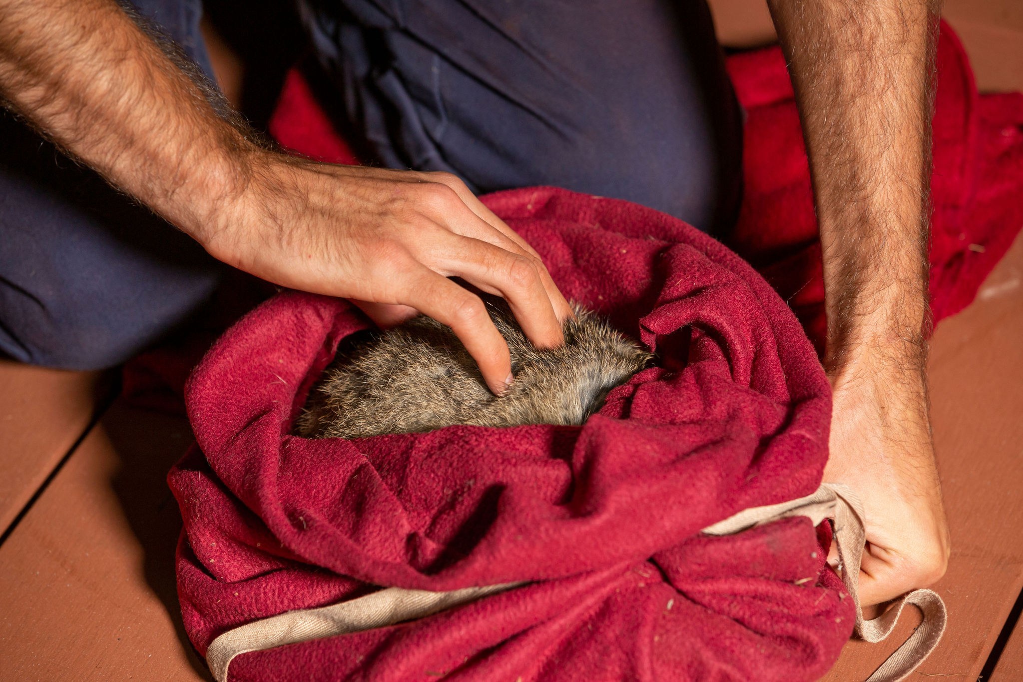 Once all the information we need is recorded, the bag and animal are gently placed on the ground and carefully opened so the captives can vacate when they are ready. Sometimes they go slowly... and sometimes they're off like a rocket! (…and then sometimes, they’re cheeky and try to get in the buckets of peanuts we have with us for an extra feed!)