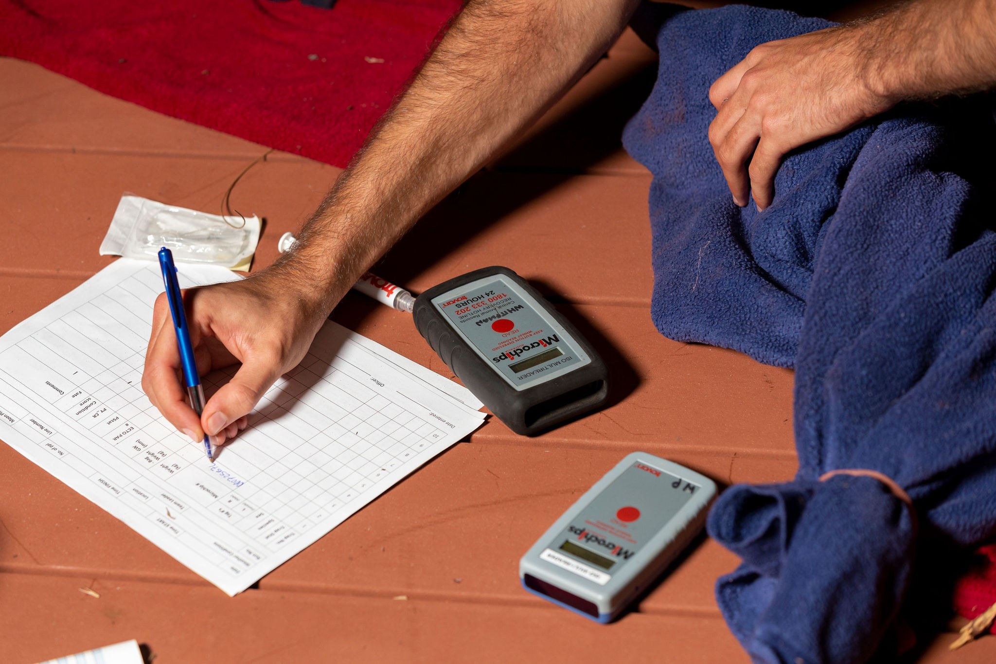 If no chip is present one is carefully added between the shoulder blades of the animal and then the sex, pouch status (if female), condition score and any parasites or other marks are noted. While the condition score tells us whether the animals are eating well, for instance, the pouch status tells us more about how well they are breeding. Success is often seen in the form of a jellybean-sized joey in a healthy-looking pouch!