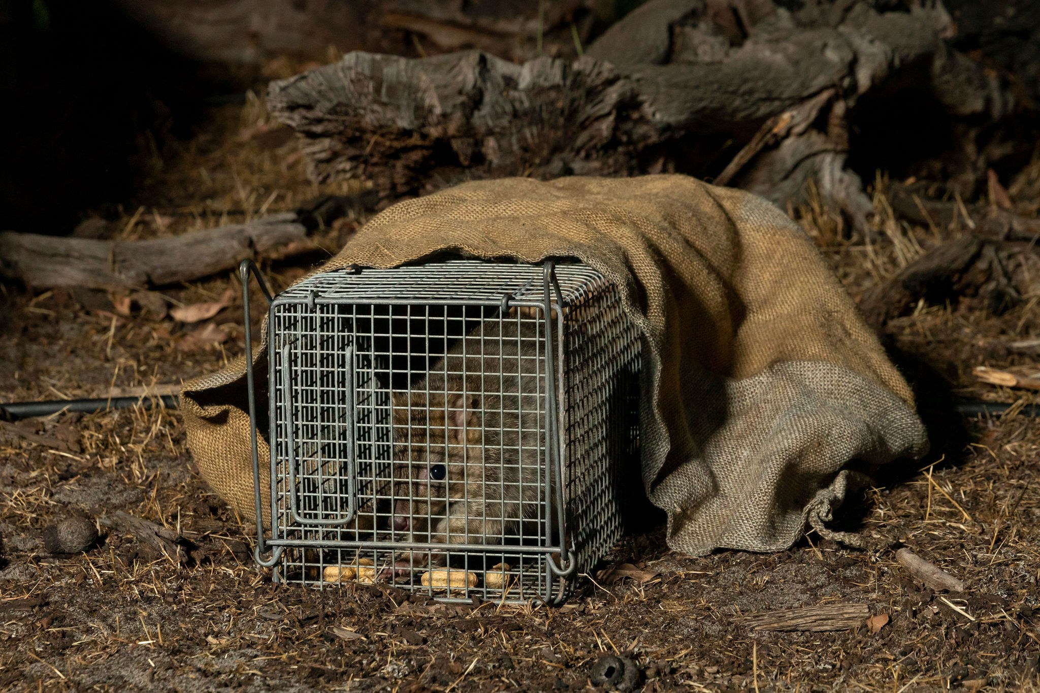 Before moving on to the next trap in the line, a hessian sack is laid over the trap to provide some cover for animals who should wander in, which helps to reduce stress.